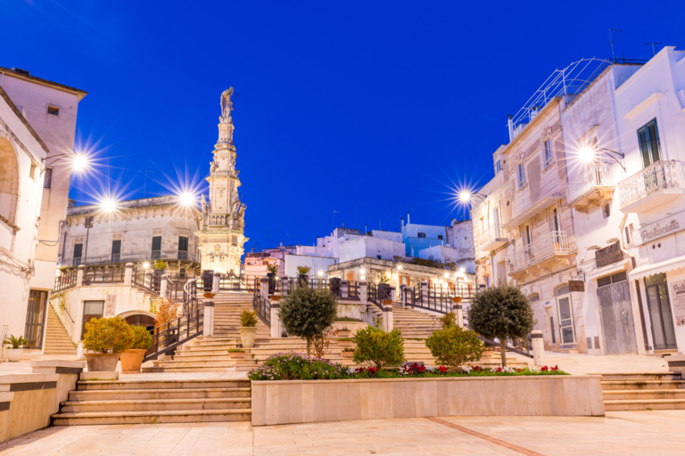 The best panoramic view of Ostuni is from the “Corso Vittorio Emanuele II” or the “Piazzetta Martiri delle Foibe,” where you can see the white cluster of houses against the blue sky and sea.